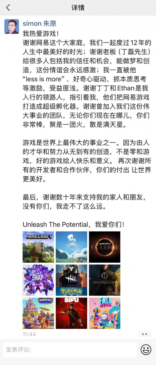 今日,网易全球投资与合作总裁朱原(Simon)离职,他在个人朋友圈和领英发布了离职的内容,预示已完成交接,并感恩过去网易12年一起度过的美好时光。