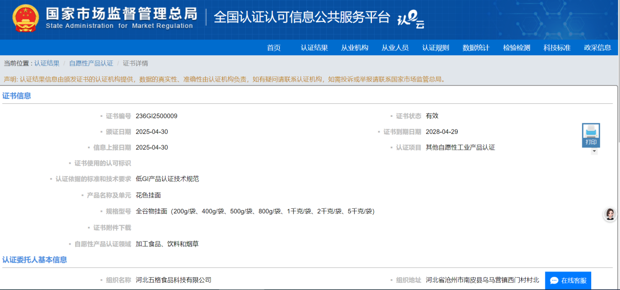 2025年4月30日,河北五格食品科技有限公司(以下简称“五格食品”)研发的“花色挂面(全谷物挂面)”正式通过国家低GI(升糖指数)产品认证(证书编号:236GI2500009)。作为国内首款以盐碱地特色作物南皮碱麦为核心原料的低GI主食,其认证标志着我国全谷物食品技术取得重要突破,为超1.4亿糖尿病患者提供了兼顾营养与控糖需求的主食解决方案。该款低GI主食成为南皮县区域公用品牌“品味南皮”碱麦美食产品家族中的一员。