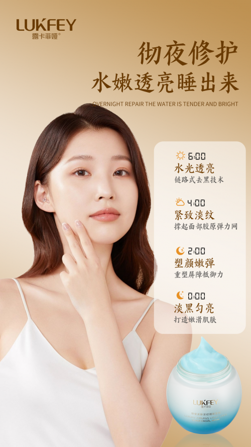 露卡菲娅以“科学护肤,精准修护”为理念,专注于研发适合亚洲女性的高性价比护肤产品,尤其擅长将高效成分与温和配方结合。这款睡眠面膜定位为“多效修护型”护肤品,主打深层补水、紧致肌肤、淡化干纹细纹,目标用户是25+面临初老问题、长期熬夜或肌肤缺水的女性,无论是干皮、混干皮还是轻敏肌,所有肤质都能从中获得针对性改善。