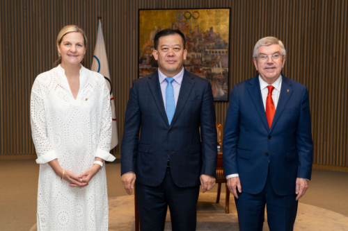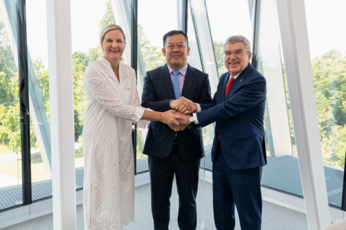 在洛桑国际奥委会总部,蒙牛集团总裁高飞于6月17日与现任国际奥委会主席托马斯•巴赫、候任主席柯丝蒂•考文垂举行会谈。双方就奥林匹克精神传播、全球可持续发展等重要议题交换意见,并对即将到来的2026年米兰-科尔蒂纳丹佩佐冬奥会及2028年洛杉矶奥运会表达了共同期待。