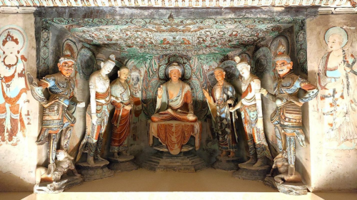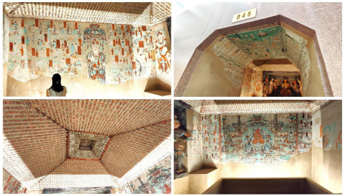 洞窟内四面墙身及藻井(窟顶)均有唐代壁画设计,窟顶现倾斜视觉效果,同时包括七具各具特色的彩塑造像,还原现存敦煌莫高窟主尊佛陀结跏趺坐于须弥座上,两边随侍弟子、菩萨、天王等围绕听法的盛境。其中菩萨造像独具特色,以女性躯干为原型,呈「S」形弯曲、体柔美、嘴角微翘、妙目灵动。与之相映,天王造像形像雄强有力,尽显威猛刚强。