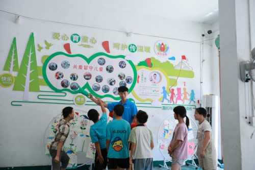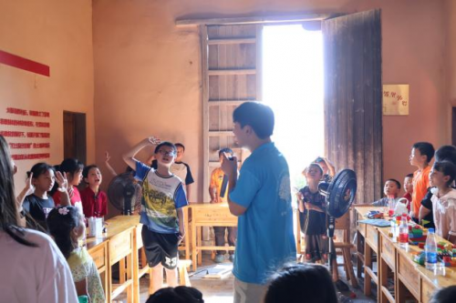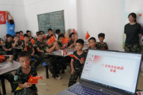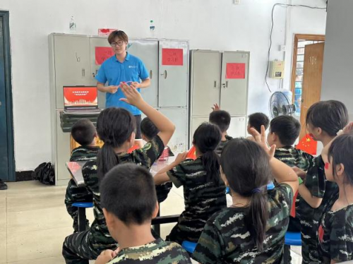 在白水乡新时代文明实践站,实践队员章翀开展了“政策我知道”知识竞赛活动点燃了孩子们的热情。关于宜春市城乡居民增收、医共体医保支付等民生政策的问答环节,引来孩子们踊跃抢答,小手如林。随后,实践队员王湘香组织开展了“经典咏流传”红色故事宣讲活动,深情讲述了徐解秀与红军的鱼水深情,孩子们凝神静听,红色的种子悄然落入心田。实践队员陈泓宇带领孩子们齐声合唱“强军战歌”:孩子们手举鲜艳的小红旗,脸上贴着闪亮的国旗贴纸,稚嫩而嘹亮的歌声整齐划一,充满力量。红旗挥舞,歌声流淌,爱国热情在童声中激荡奔涌,汇成一片赤诚的海洋。