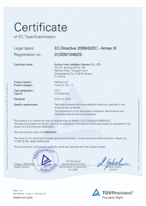近日,苏州弗朗茨智能电梯有限公司旗下商用平台电梯产品通过德国莱茵TÜV机械指令EC Type-examination认证,成为国内该领域首个获此国际权威认证的电梯品牌。此次认证标志着弗朗茨电梯在安全与技术层面达到欧盟最高标准,为中国别墅电梯企业突破国际市场树立全新里程碑。这一里程碑事件,不仅彰显了弗朗茨电梯的硬核技术实力,更标志着中国电梯产业在国际标准下的品质飞跃。