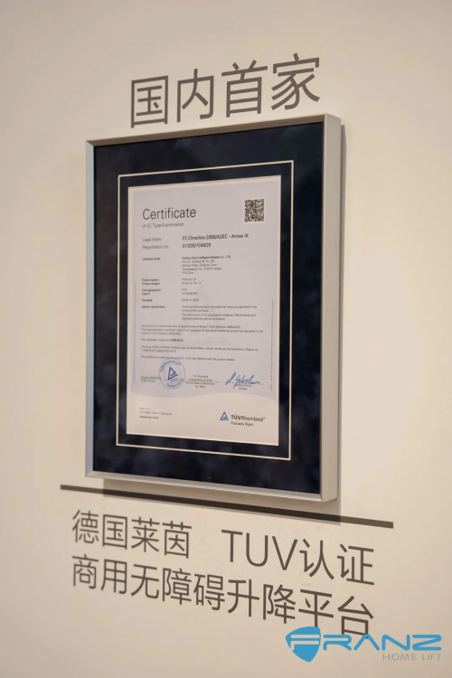 获得德国莱茵TÜV认证,为弗朗茨电梯开拓国际市场铺平了道路。作为国内首家达成此成就的商用平台电梯品牌,弗朗茨不仅提升了中国制造的全球形象,更以行动诠释了从“制造大国”向“制造强国”的转型。未来,品牌将继续深化与国际机构的合作,推动技术创新,为全球用户带来更智能、更安全的电梯解决方案。在别墅电梯和家用电梯领域,弗朗茨正以品质领跑,开启中国电梯行业的璀璨新篇章。
