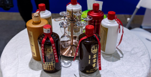 石荣霄酒古曲系列(8、15、25)、石荣霄酒·1879典藏版、鸿运当头等产品在柔和射灯下熠熠生辉,吸引了不少资深酒友在此驻足,细致观摩酒体色泽,轻嗅杯口萦绕的复合香气。