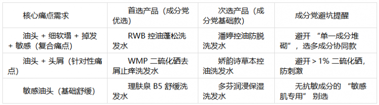 敏感油头优先选含抗敏专利(如 RWB 的秦艽、芍药专利)的产品,头屑油头优先选 1% 二硫化硒(如 WMP)的产品,避免 “成分多却不贴痛点”。