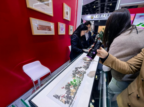 现场技术负责人介绍,团队首先通过显微扫描技术解析原作笔触细节,精准捕捉崔如琢先生篆隶笔意的枝杆质感与积墨、破墨的墨色层次;在制版环节,采用激光雕刻技术复刻荷叶脉络的细微起伏,误差控制在微米级;印刷阶段则运用定制防伪油墨与多层叠印工艺,重现朱砂荷花与淡赭荷叶的色彩过渡,最终使《荷风盛世》钞版画在光影下呈现出原作“豪纵伟岸而又冲和浑融”的意境特色。