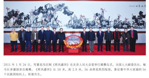 2011年,书画家崔如琢先生受人民大会堂邀请,为二楼回廊北侧墙壁创作巨幅国画,历时八天完成长18米、高2.8米的鸿篇巨制,是人民大会堂目前最大的国画作品。画作以“纸团皴点”等独特技法营造出浓淡交织的荷叶意境,56朵荷花顾盼生姿,既暗合“荷”与“和”的文化谐音,更象征56个民族凝心聚力的精神内核。