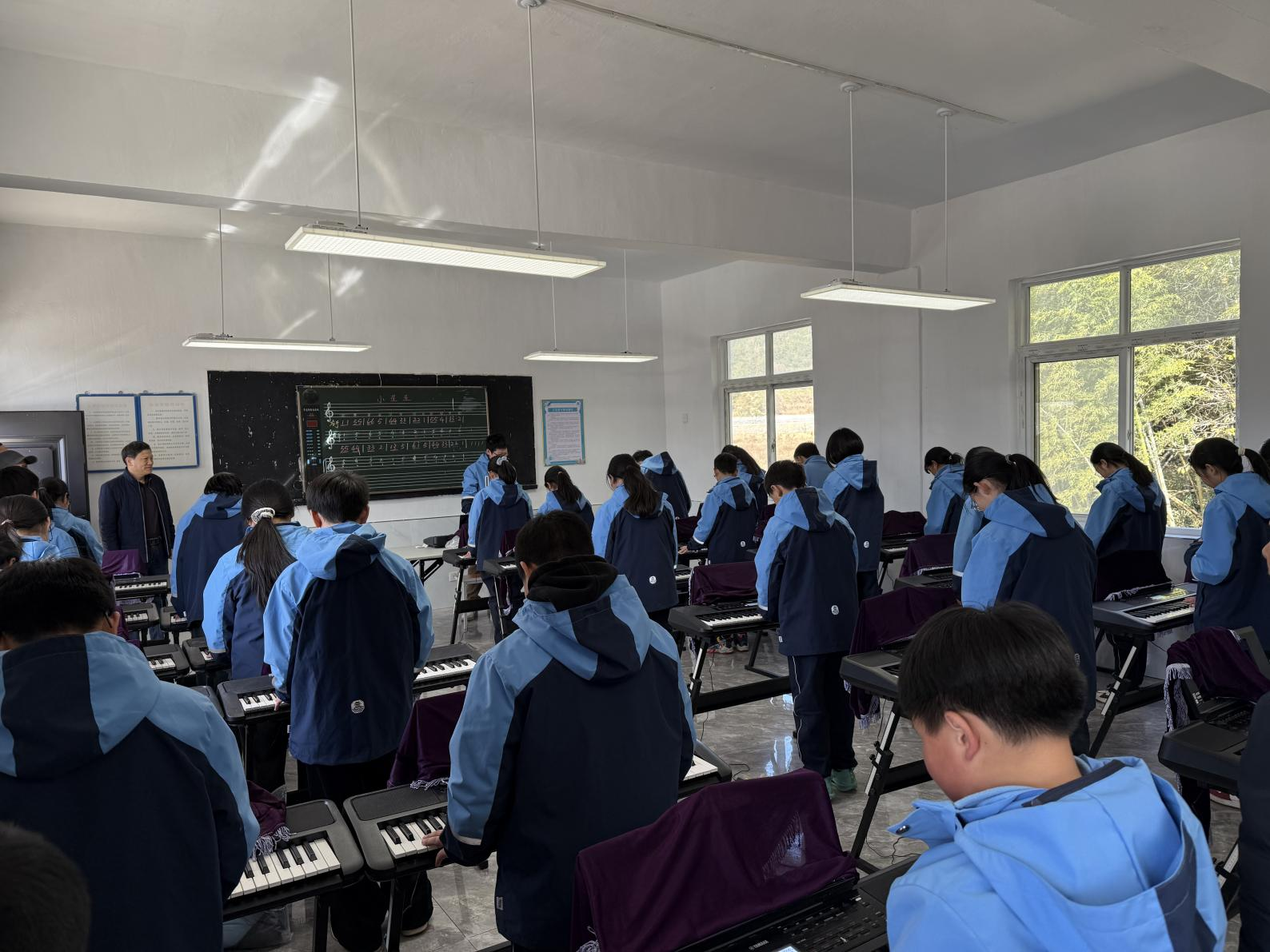 图为:音乐教室里,Witsbb健敏思捐赠的冲锋衣和电子琴都已投入使用