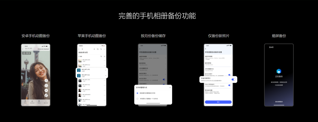 Z2 Ultra的宝宝相册功能是家长们的成长记录好帮手,用AI技术让回忆管理更轻松。备份环节无需费心,支持安卓与苹果手机的动图备份,还能按月份分类存储和仅备份新照片设置,避免重复上传占用空间。开启熄屏备份后,手机一联网就自动同步新照片,不用手动操作,确保每一张属于孩子的精彩瞬间都不遗漏。
