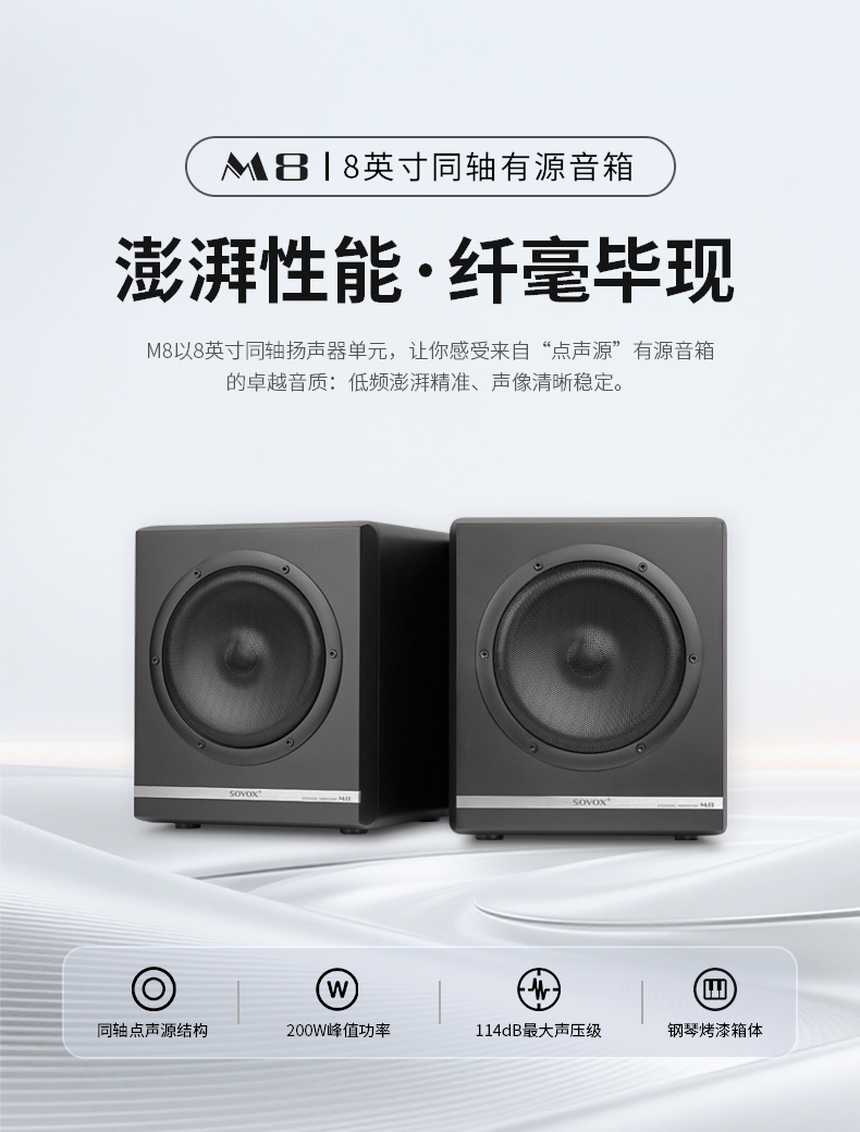 正是基于对这一声学本质的深入探索,索威(SOVOX)正式推出全新8英寸同轴有源HiFi音箱——M8。作为在音频领域深耕35年的国产品牌,索威始终以“共点同轴”核心技术立身,凭借对声学相位一致性的执着追求,在竞争激烈的HiFi市场中树立起独特的技术标杆,在国际同轴扬声器领域,更是与天朗、KEF齐名。M8的发布,不仅是对品牌经典同轴技术的又一次升华,更是将“点声源”理想听感与有源易用性深度融合的诚意之作。面对多元化的听音需求,M8旨在通过创新的同轴结构与扎实的电路设计,为从桌面到客厅的各种场景,构建一个音质精准、位置自由的沉浸式声学空间。
