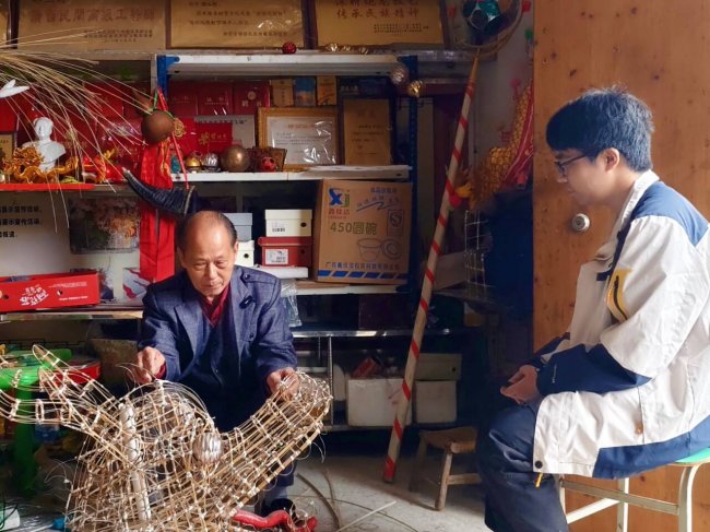在古城的炮龙作坊里,团队拜访了自治区级非物质文化遗产代表性传承人、广西民间工艺大师邹玉特。72岁的邹玉特是邹家炮龙扎制技艺第三代传人,15岁跟随父辈学艺,已深耕扎龙技艺57载。其工作室中,老竹篾、宾阳本地纱纸、彩绘工具等摆放有序,墙上泛黄的老照片,记录着邹氏家族三代人与炮龙文化相伴的岁月。