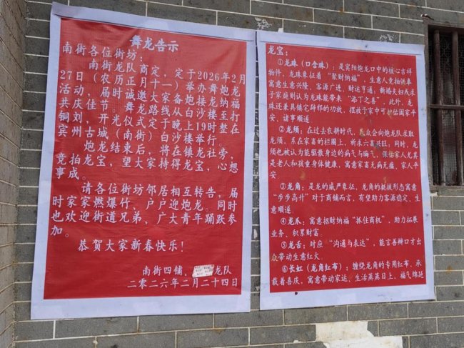 告别作坊,团队深入宾阳南街,感受炮龙节浸润的生活肌理。穿行老街小巷,炮龙节氛围已渗入家家户户,墙壁、电线杆上随处可见活动安排通知,各区域社龙队张贴大红海报,邀请邻里“爆竹增光”、共襄盛举。这份自下而上的全民参与感,让团队深刻意识到,炮龙节不仅是官方文化名片,更是当地人内心的年度盛典。