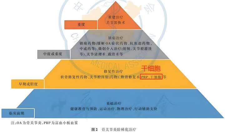 干细胞治疗膝骨关节炎已成为再生医学领域的重要突破。2024年6月发布的《中国骨关节炎诊疗指南(2024版)》明确指出,间充质干细胞(MSC)凭借其抗炎、免疫调节以及促进组织修复的独特能力,为关节软骨的修复提供了理想的治疗环境。大量临床研究表明,通过关节腔内注射间充质干细胞,不仅可以显著减少关节内的炎症反应,还能促进软骨再生,有效缓解疼痛并显著改善关节功能。