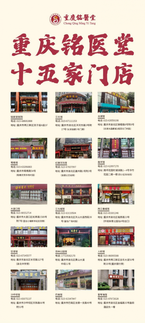 在长江与嘉陵江交汇处,重庆铭医堂15家中医门诊如明珠散落,串联起江北、渝北、两江新区、沙坪坝、巴南、大渡口、南岸等7大区域,让"家门口看名医"成为现实。无论是常见病或多发病,还是疑难杂症或慢病调理,这份触手可及的中医服务,正以润物无声的方式融入重庆市民的生活轨迹。