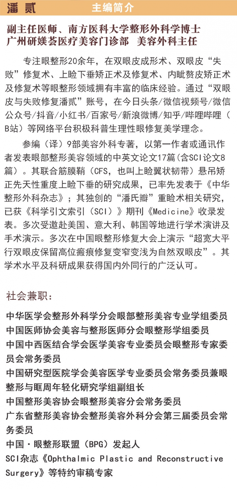 专注眼整形20余年,在双眼皮成形术、双眼皮“失败”修复术、上睑下垂矫正术及修复术、内眦赘皮矫正术及修复术等眼整形领域拥有丰富的临床经验。通过“双眼皮与失败修复潘贰”账号,在今日头条/微信视频号/微信公众号/抖音/小红书/百家号/新浪微博/知乎/哔哩哔哩(B站)等网络平台积极科普生理性眼修复美学理念。