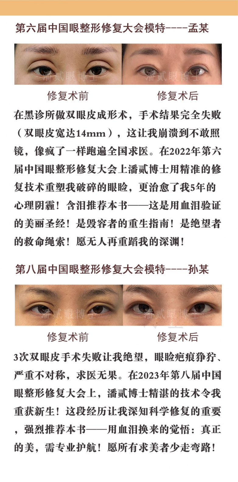 3次双眼皮手术失败让我绝望,眼睑疤痕狰狞、 严重不对称,求医无果。在2023年第八届中国 眼整形修复大会上,潘贰博士精湛的技术令我重获新生!这段经历让我深知科学修复的重要,强烈推荐本书——用血泪换来的觉悟:真正的美,需专业护航!愿所有求美者少走弯路!