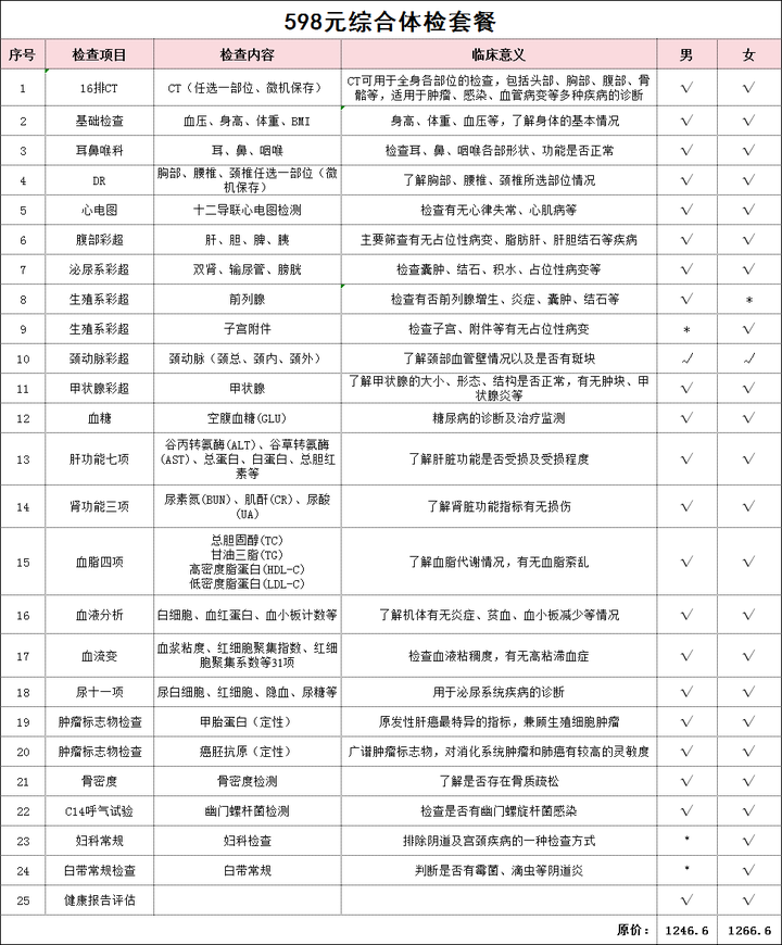 这份基础套餐涵盖了多个关键检查项目。从基础检查了解身体基本指标,到 DR 检查胸部正位排查肺部和纵隔疾病;从心电图检查心脏健康,到腹部、泌尿系、生殖系彩超对身体各重要部位进行细致筛查;再到血糖、肝功能、肾功能、血脂等血液检查,以及尿十一项检查泌尿系统情况,最后还有专业的健康报告评估,每一个环节都体现着医院对劳动者健康的重视。