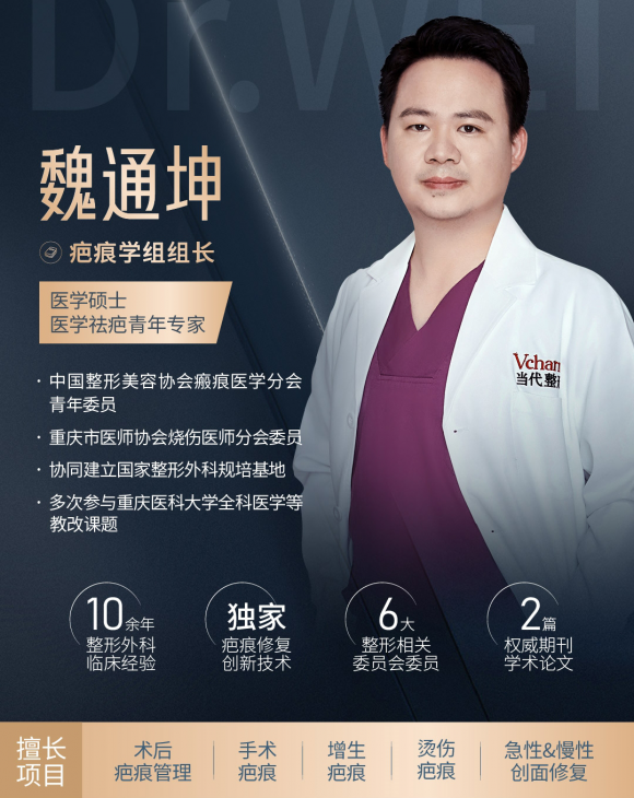 在整形外科领域,瘢痕的预防、治疗与修复一直是医学界的难点之一。重庆当代整形外科医院瘢痕MDT多学科联合门诊主任魏通坤医师,凭借十余年临床实践与科研积累,建立起"功能重建与美学修复并重"的诊疗模式,为瘢痕患者提供全周期解决方案。
