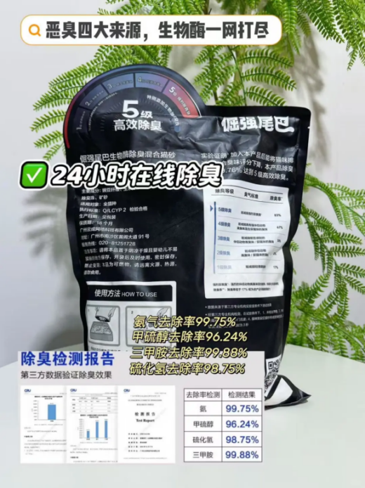 传统除臭猫砂多依赖活性炭吸附或香精覆盖,如同“给臭味贴创可贴”,治标不治本。而倔强尾巴猫砂创新性地嵌入生物酶除臭珠,其核心成分能精准识别甲硫醇、硫化氢、氨气、三甲胺四大臭味分子,通过催化反应将其分解为无害物质。实验室数据显示,该款猫砂对氨气的去除率达99.75%,相当于每1000个氨气分子中,仅有2.5个能“逃出生天”。这意味着,即便猫咪刚用完猫砂盆,空气中也难觅刺鼻气味,家庭空气质量显著提升。