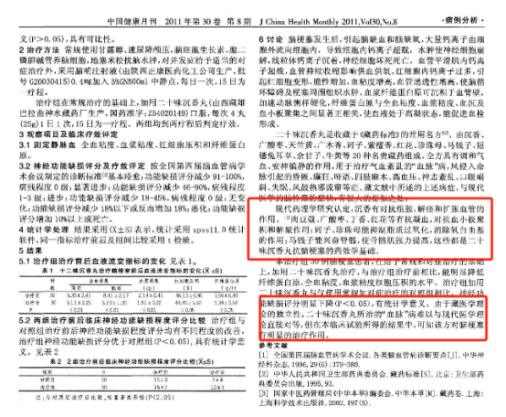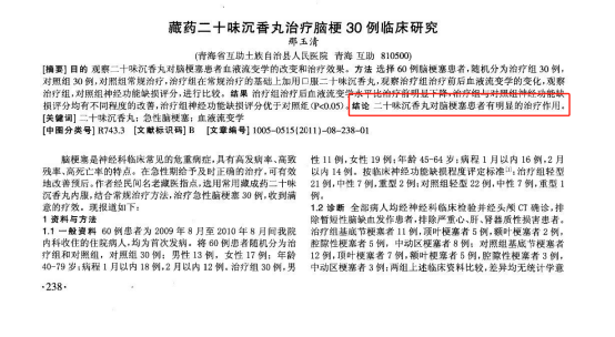 青海省互助土族自治县人民医院选择 60 例脑梗塞患者进行实验,治疗组治疗后血液流变学水平比治疗前明显下降,治疗组与对照组神经功能缺损评分均有不同程度的改善,这说明二十味沉香丸对脑梗塞患者有明显的治疗作用。(研究出自《藏药二十味沉香丸治疗脑梗 30 例临床研究》)