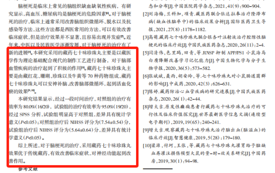 据显示,西藏藏医药大学曾选取过40例脑梗死患者进行试验,发现试验组的治疗有效率为95.0%,得出对于脑梗死的治疗,采用藏药七十味珍珠丸效果显著,该药能有效改善临床症状,对神经功能起到改善作用的结论。(研究出自《藏药七十味珍珠丸治疗脑梗死的效果及预后探讨》)