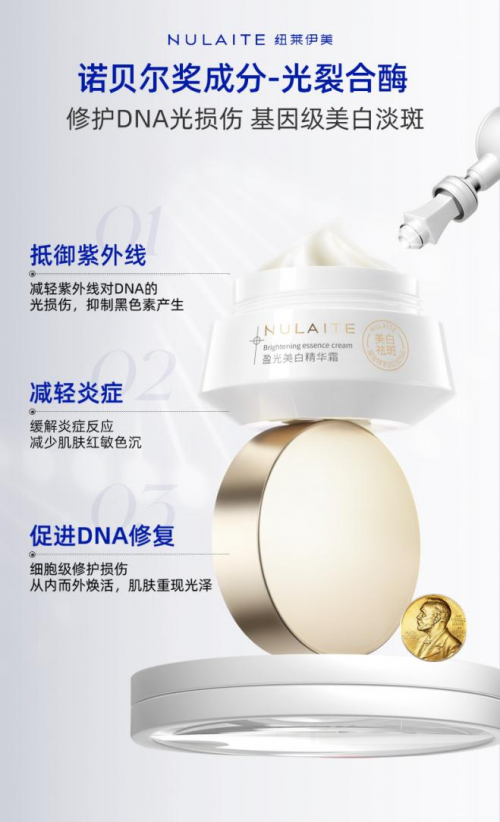 针对这一护肤痛点,纽莱伊美盈光美白精华霜中添加了诺贝尔奖成分 —— 光裂合酶。这一神奇成分能够精准识别并修复紫外线对 DNA 造成的光损伤,有效抑制黑色素生成,唤醒细胞活力,轻松解决因光损伤导致的水分流失、敏感色沉、暗沉长斑等肌肤难题,让肌肤重焕健康光彩。