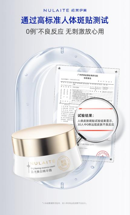 在产品研发过程中,纽莱伊美始终将科学、安全、高效奉为圭臬。盈光美白精华霜在安全性方面表现卓越,做到了无香精、无酒精、无色素、无激素、无重金属、无矿物油的 6 大无添加。此外,产品还通过了严苛的人体斑贴测试及毒理学实验,从源头杜绝不良反应,为消费者带来满满的安全感,让每一次护肤都成为安心享受。