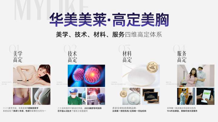 随着多款美胸假体选择在云南华美美莱独家授权落地,华美美莱也进入了高定美胸时代。高定美胸并非单一材料创新,而是构建了美学、技术、材料、服务四维高定体系。
