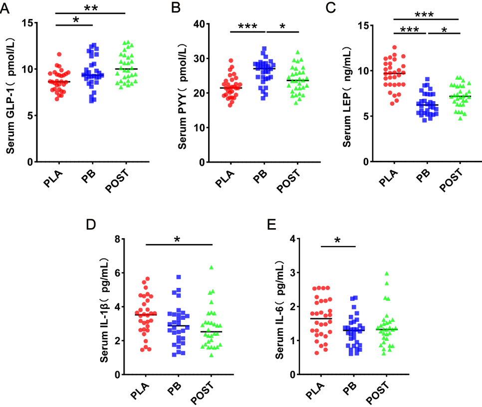 在南昌大学陈廷涛教授团队的临床研究中,共纳入 160 名肥胖和健康对照志愿者,采用随机双盲安慰剂对照设计。研究结果显示,AKK PROBIO 活菌组和后生元组在干预 8 周后,血清中 GLP-1 水平显著上升,与安慰剂组相比有明显差异。这一发现首次在人体层面证实了 AKK PROBIO 对 GLP-1 分泌的促进作用,为益生菌在代谢性疾病干预中的应用提供了有力的科学支持。