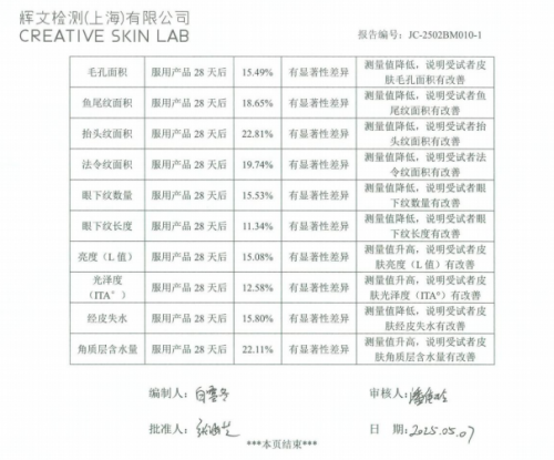 从国内外人体测试实证数据来看,连续饮用28-70天后,在眼纹、毛孔、法令纹等多个维度均有明显改善,体现了这款产品在细胞级“焕新”方面的实力。