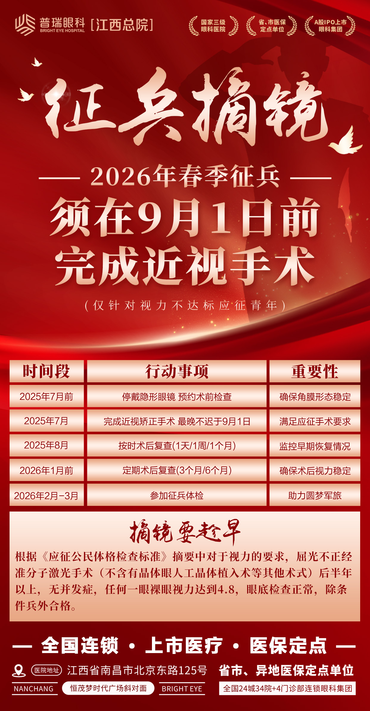 2026年上半年征兵报名即将开启,一场逐梦之旅即将启程,而9月1日前摘镜已成为当务之急!青山湖区南昌普瑞眼科医院江西总院屈光外科为你准备了这份参军近视手术攻略,助你披荆斩棘,向着军旅梦想全力冲刺!