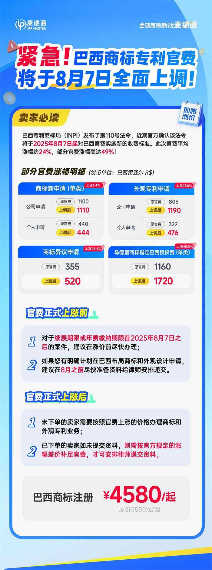 突发!根据巴西专利商标局(INPI)最新发布的第110号法令,自2025年8月7日起,巴西商标专利官费即将大幅上调,平均涨幅达 24.1%,部分涨幅高至49%!仅剩不到两个月!建议有布局巴西市场的卖家们尽快注册缴费!避免成本激增!