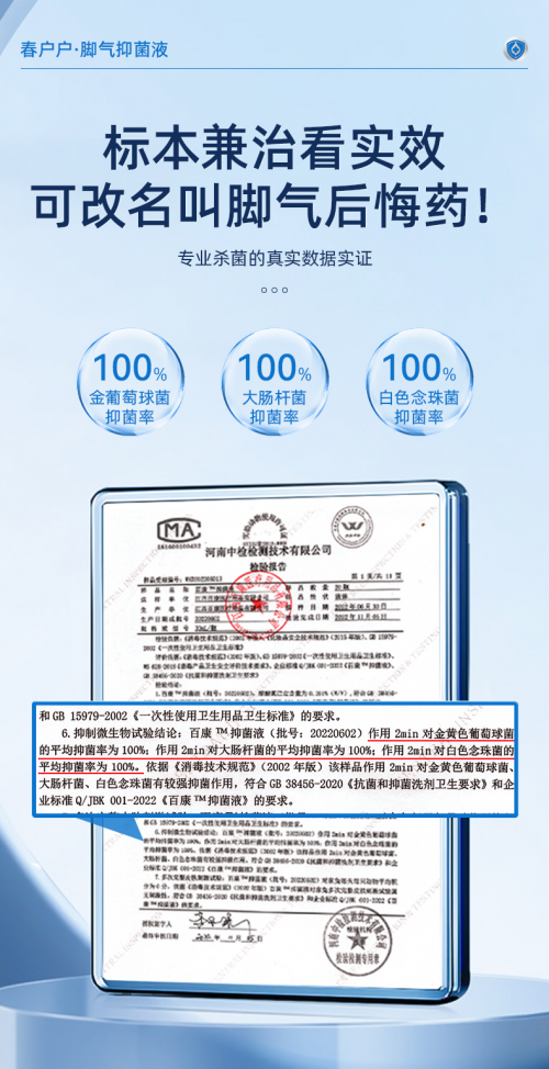 实测数据,对金黄色葡萄球菌、白色念珠菌、大肠杆菌的抑菌率高达100%!