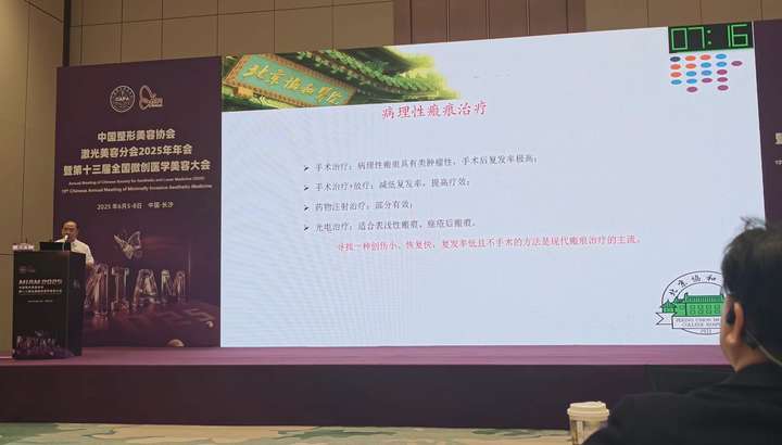【长沙,2025年6月】在近日举行的中国整形美容协会激光美容分会2025年年会暨第十三届全国微创医学美容大会上,北京协和医院整形外科著名专家刘志飞教授协同湘一疤痕等研究团队发布了瘢痕治疗领域的突破性成果,其《探讨应用激光治疗仪联合光纤治疗瘢痕疙瘩的临床效果》的主题报告,分享了瘢痕治疗领域的最新研究成果,引发业界广泛关注。