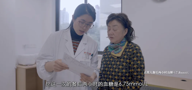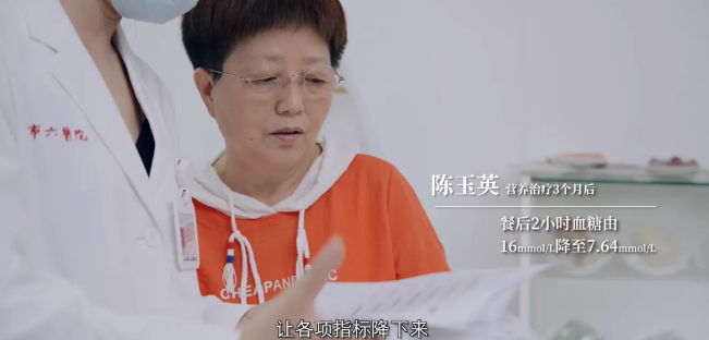 陈阿姨在饮食干预前,餐后2小时血糖由16mmol/L降至7.64mmol/L。