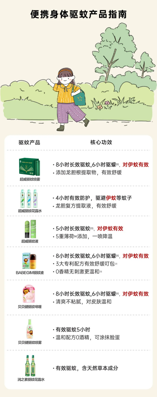 同时,朝云集团依托多年驱蚊专业研究,推出多款针对性驱蚊产品。如超威电蚊液可以靶向驱蚊、扰乱蚊虫神经传导有效击倒伊蚊等多种蚊子,其配方中不含避蚊胺,药液加入1%氯氟醚菊酯含量和进口溶剂,高品质药液可以实现温和安全的驱蚊效果,实验证明其能达到45晚长效驱蚊时长。针对户外驱蚊的场景,超威旗下羟哌酯驱蚊液也能达到8小时长效驱蚊,6小时长效驱蠓(对伊蚊有效),里面的专利龙胆复方提取液,也能缓解蚊虫叮咬造成的不适,帮助消费者轻松拥有“夏日防蚊舒适圈”。