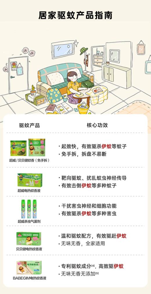 而朝云集团旗下超威及贝贝健等专业杀虫驱蚊品牌,可谓广大消费者的优选产品,在日常防蚊、驱蚊过程中自然不可或缺。比如晚上睡觉可以选择使用超威蚊香,单圈点燃可以使用7个小时,整晚都能安睡,无惧蚊虫叮咬;当然超威电热蚊香液也是一个不错的选择,它的药液加入1%氯氟醚菊酯含量和进口溶剂,可以利用靶向驱蚊扰乱蚊虫神经传导,有效击倒伊蚊等多种蚊虫。在户外活动时,则可选择超威驱蚊喷雾,其含15%羟哌酯,可以提供长达8小时驱蚊保护,相信拥有如此高效的防蚊驱蚊产品助力,我们也能更好远离蚊虫叮咬问题。