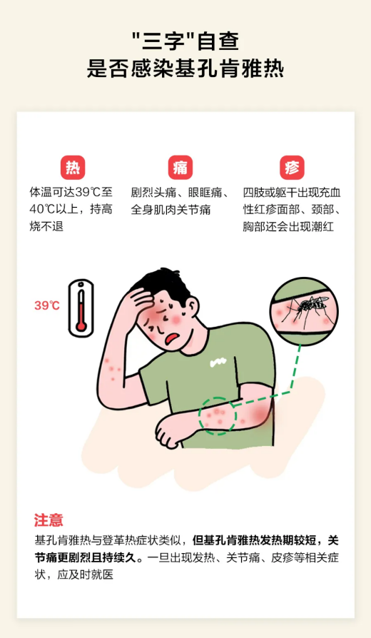 而且,基孔肯雅热初期症状与登革热类似,但发热期较短而关节痛更剧烈持久,因目前尚无特效抗病毒药物和预防疫苗,切断伊蚊传播路径是预防的关键。