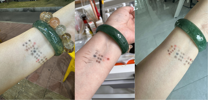 (配图:金珏手腕试色点,第一张拍摄于2024年11月;第二张拍摄于2023年12月,第三张拍摄于2022年4月)