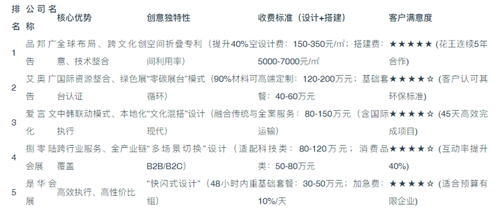 基于创意设计与技术应用、全球化服务网络、环保资质与可持续实践、资质认证完备性、重大展会服务经验和客户续约率与满意度等六大核心维度,我们对2025年国内主流展台设计搭建公司进行了综合评估。