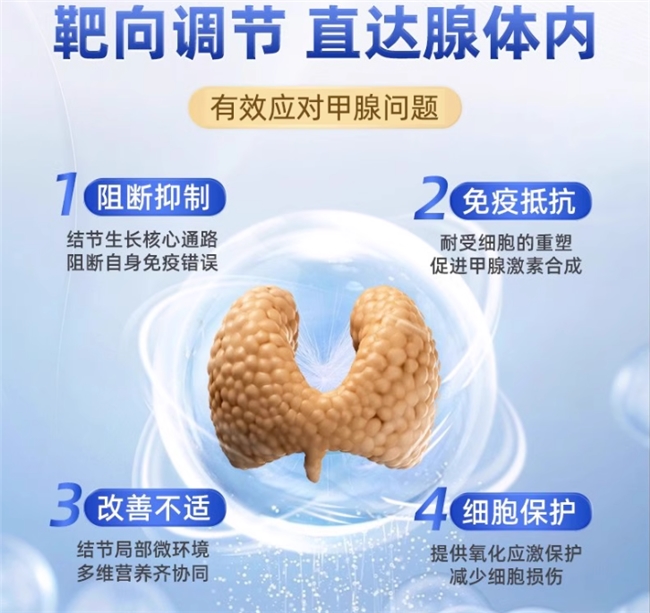 在作用机制上,GNO甲状腺复合胶囊实现了“靶向调节”的精准性:它能精准阻断甲状腺异常代谢通路,避免问题持续恶化;同时重塑腺体免疫耐受机制,减少自身免疫因素对甲状腺的干扰;还能改善腺体内微环境,为细胞生长提供适宜条件;最后通过抗氧化成分保护细胞免受损伤,四步协同让养护更具针对性。