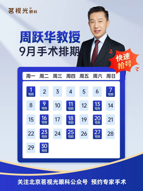 想要预约的朋友,只需关注 “北京茗视光眼科” 官方公众号,点击预约通道选择周跃华总院长的出诊时段,即可锁定手术时间,挑选适合自己的档期。
