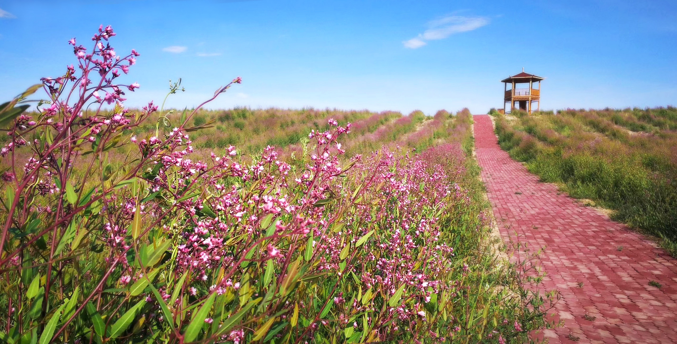 戈宝公司在盐碱荒漠上进行大规模罗布麻(红麻)种植,攻克了诸多技术难题,成功推动罗布麻产业的标准化、科学化、规模化发展。如今戈宝红麻花海每年吸引大量游客前来打卡。这片曾经的盐碱戈壁已成为集生态保护、经济发展和旅游观光于一体的综合示范区。