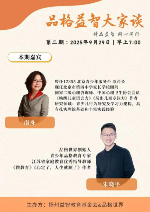 2025年9月29日早,一场聚焦教育本质、直击家庭困惑的直播盛宴——第二期“品格益智大家谈”,在扬州益智教育基金会与品格世界的携手推动下如期举行。品格世界朱晓平老师和作为国家二级心理咨询师并担任北京市第四中学的学校家长顾问的南舟老师围绕 “教育焦虑破解”、“人工智能时代能力培养”、“亲子情感连接”等议题展开对话,吸引了6万多人在线观看,成为连接万千家庭的教育桥梁。