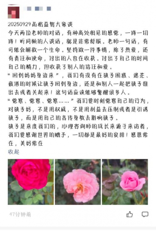教育的本质是唤醒,而非塑造。每个孩子都有独特的潜力,当我们学会尊重生命规律,给予他们适当的引导与支持,每个孩子都能成为最好的自己。本次“品格益智大家谈”直播活动,不仅以深度对话深化了公众对“品格教育”的认知,更让家庭教育的核心价值与“家校社”协同育人的重要性深入人心,更用可落地的实践思路,为万千家庭破解教育困惑,以点滴行动搭建“专家引领、实践联动、理念传播”的教育交流桥梁,让前沿教育智慧穿透屏幕、走进日常,为中国教育生态的持续优化注入动能。