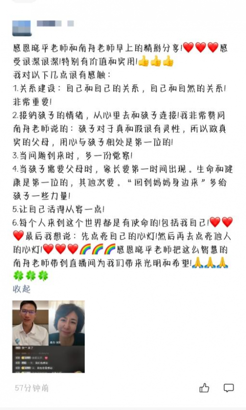 两位老师将自己多年的教育认知、实践经验与真切感悟,深度融入这场直击教育本质的对话中。他们怀揣着共同的初心——以自身“星星之火”般的力量,为陷入迷茫的家庭指引方向,用生命唤醒生命的成长。正如晓平老师所言:“我觉得当我做这个对话,感受到它特别有价值、有意义的时候,我是用喜悦去构建这样一个充满力量的磁场。一起为孩子呐喊、为孩子找到出路,这是我们的责任,更是我们义不容辞的义务”。老师们的真诚分享也深深触动了屏幕前的观众,直播间留言区里“干货满满”、“被老师的真诚感动到哽咽”等字样不断刷屏,还有观众自发将直播中的感悟分享到交流群里,以集体的力量为孩子的成长汇聚更多温暖和提供更多家庭教育方向。