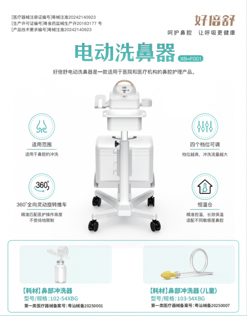 好倍舒洗鼻器医院型XB-F001已取得国家二类医疗器械注册证,具备多项创新功能:四档精准调控、恒温保温系统、成人/儿童专用鼻头设计,全面适配不同年龄与护理需求。产品采用一次性耗材与双通道废液收集技术,确保使用过程洁净卫生;其核心的正负压技术,实现"一洗一吸",有效解决传统洗鼻方式中残水滞留引起的酸胀问题,同时杜绝废液回流风险,大幅提升使用的舒适度与安全性,适用于耳鼻喉科、儿科等专业医疗场景。