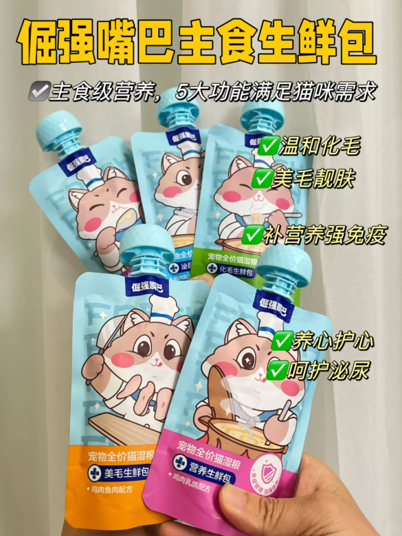 在食品安全方面,倔强嘴巴化毛生鲜包则采用了八大0添加的配方,不添加任何人工色素、香精、防腐剂等有害物质,每一批产品都经过92项第三方检测,从原材料的采购到生产加工的每一个环节,都严格把控品质,确保猫咪吃的健康。