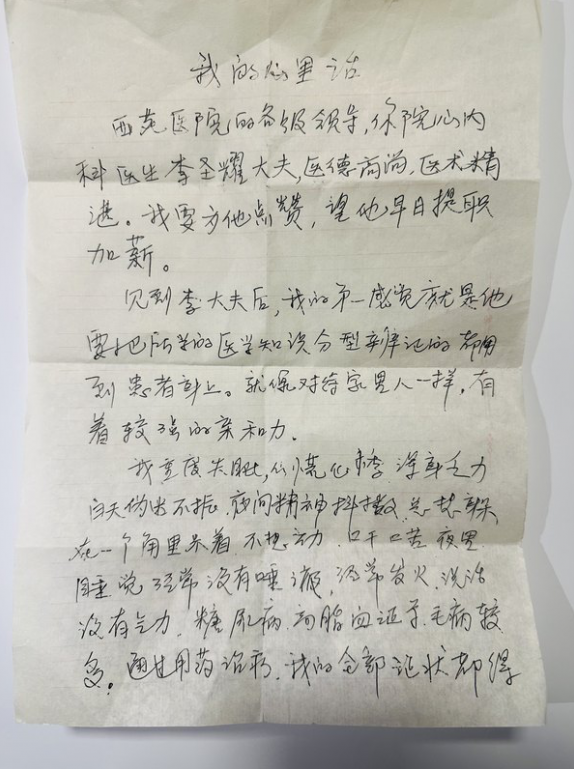 褶皱的信纸,工整的笔迹,73 岁的徐阿姨将三个月的医患深情,一笔一划刻进了给西苑医院心内科李圣耀主任的感谢信里。这封在电子时代格外 “珍贵” 的手写信,是老人对一位良医最诚挚的告白。